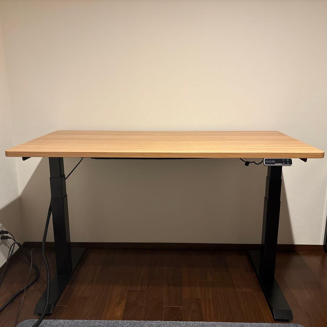 LOWYAのパソコンデスクです。電動昇降式デスク スタンディングデスク 幅140cm 奥行き60cm テレワーク。サイズは幅100cm×奥行60cm×高さ70cm、天板はナチュラルカラーの突板仕上げです。【新品未使用】ニトリ デスク Nトリシア120(ブラック)。日常的に使っていたため、細かな傷などはありますが、天板に大きな凹みなどはなく、実用上は問題ないかと思います。カリモク パーソナルデスク。| カテゴリー: | 家具・インテリア>>>机・テーブル>>>パソコンデスク |